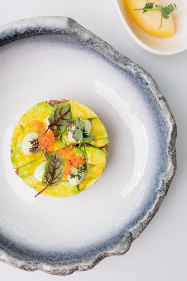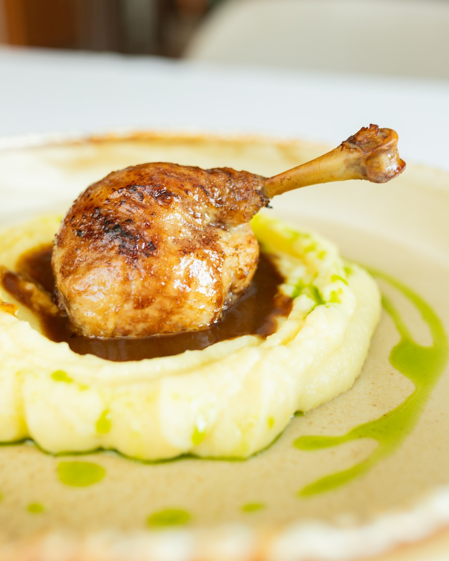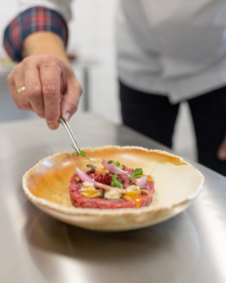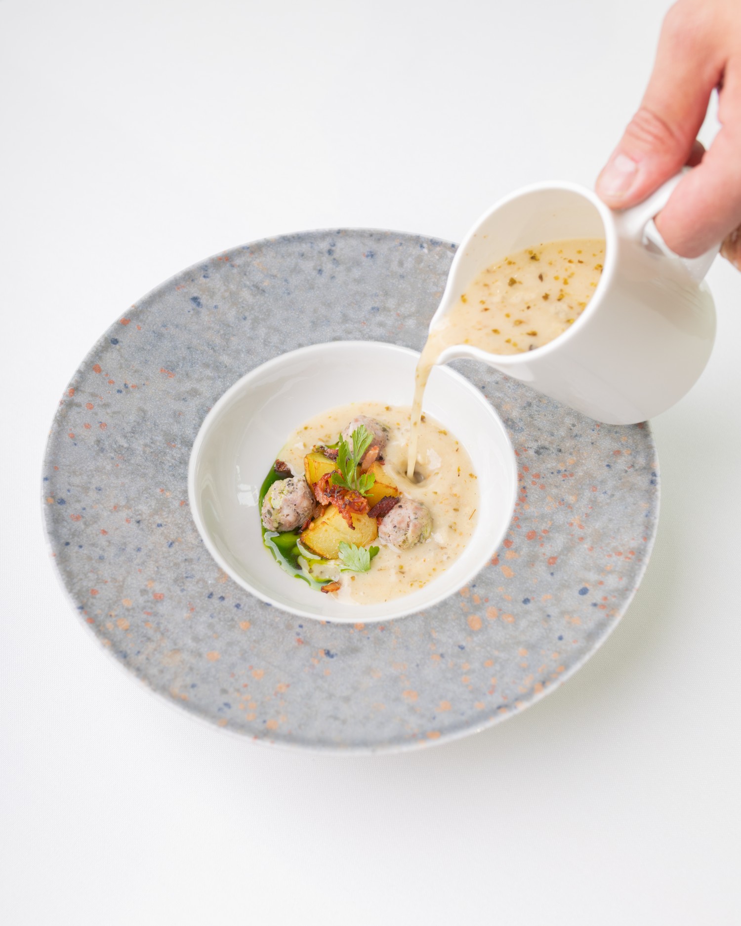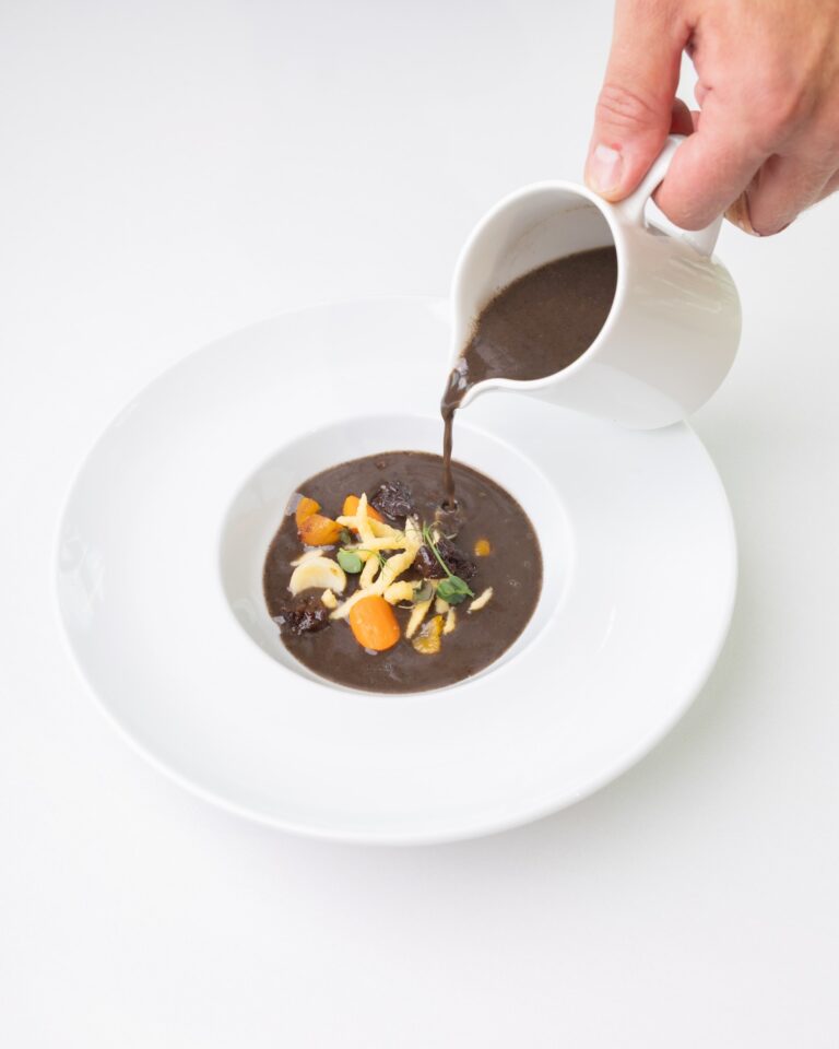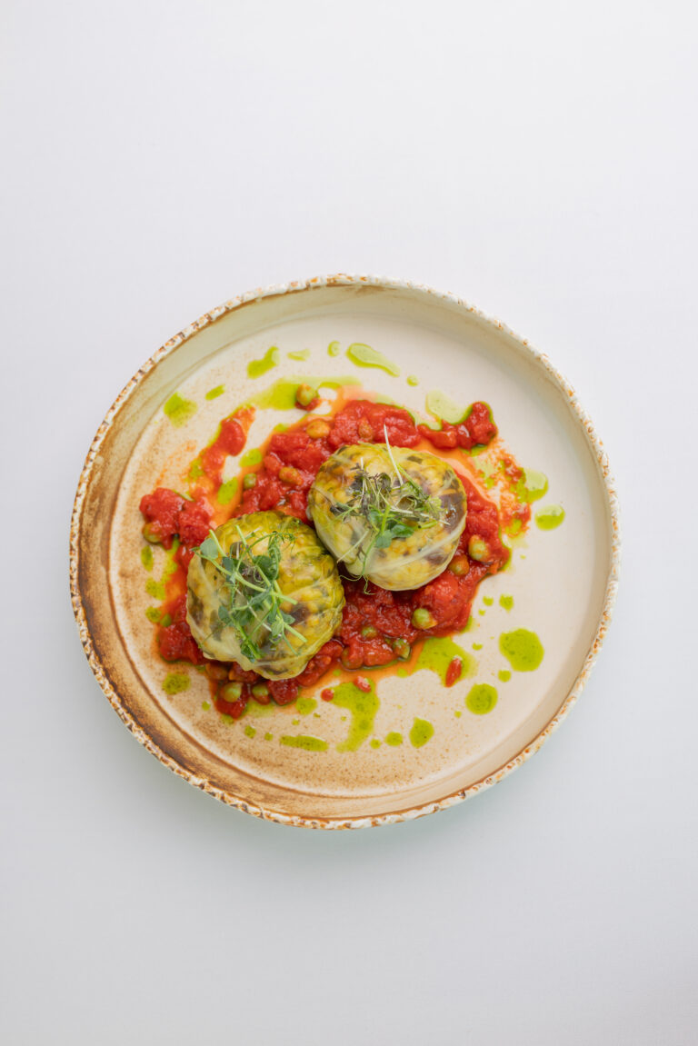 pierożki z kaczką / duszone warzywa / chrust z palonego pora / oliwa ziołowa