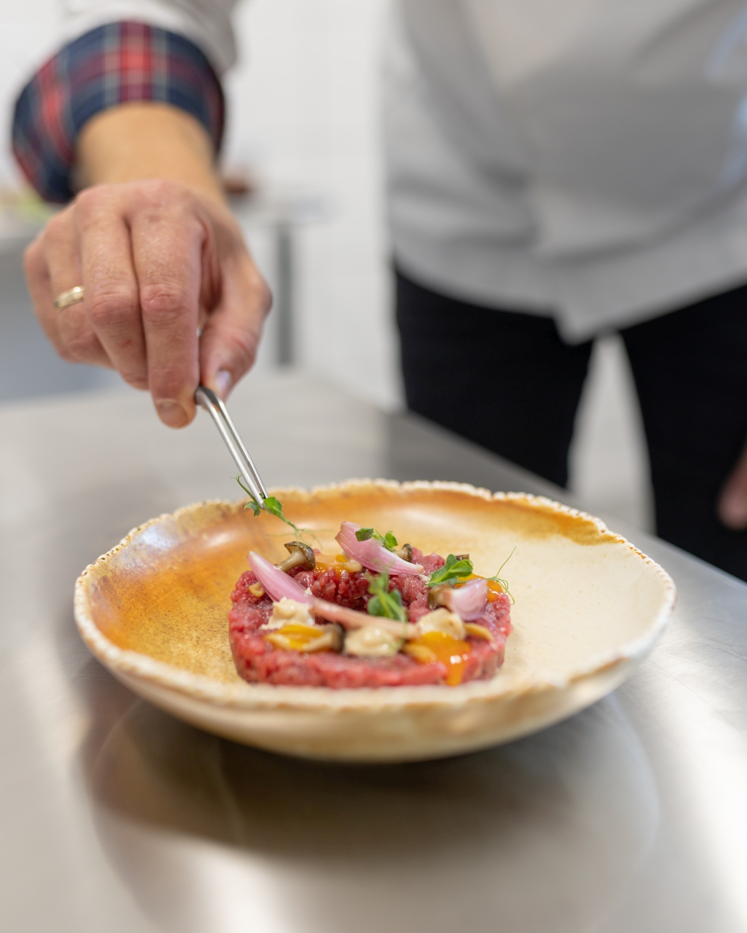 grzybek shimeji / piklowana szalotka / majonez borowikowy / żółtko / oliwa ziołowa/ świeże pieczywo