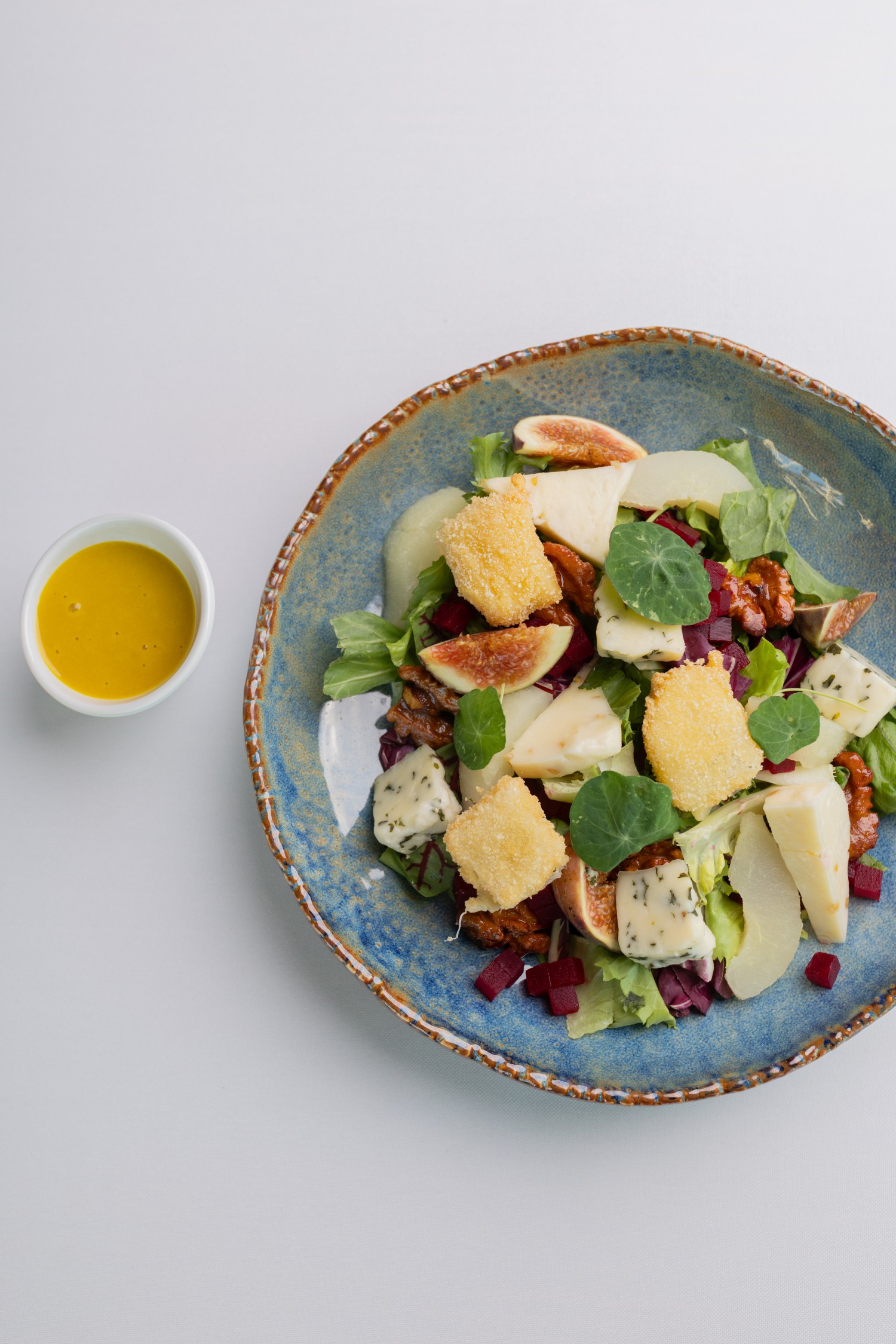 panko / jajko w koszulce / puree ziemniaczane z chrzanem / ogórki w śmietanie